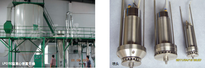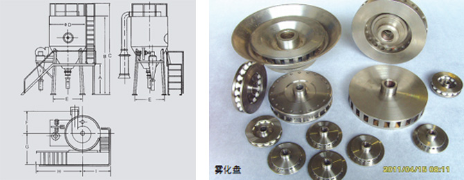 空氣經過濾和加熱,進入干燥器頂部空氣分配器,熱空氣呈螺旋狀均勻地進入干燥室。料液經塔體頂部的高速離心霧化器,(旋轉)噴霧成極細微的霧狀液珠,與熱空氣并流接觸在極短的時間內可干燥為成品。成品連續地由干燥塔底部和旋風分離器中輸出,廢氣由風機排空。