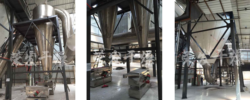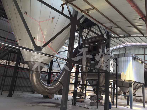 空氣經(jīng)過濾和加熱,進(jìn)入干燥器頂部空氣分配器,熱空氣呈螺旋狀均勻地進(jìn)入干燥室。料液經(jīng)塔體頂部的高速離心霧化器,(旋轉(zhuǎn))噴霧成極細(xì)微的霧狀液珠,與熱空氣并流接觸在極短的時(shí)間內(nèi)可干燥為成品。成品連續(xù)地由干燥塔底部和旋風(fēng)分離器中輸出,廢氣由風(fēng)機(jī)排空。