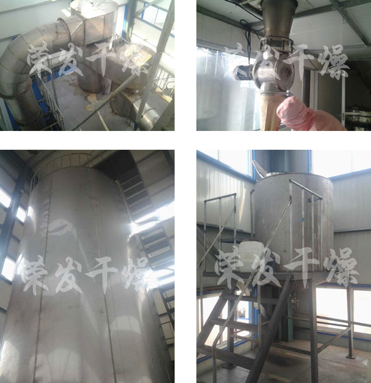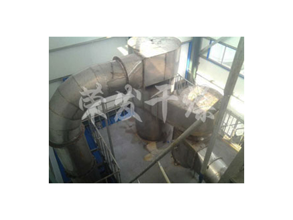 空氣經(jīng)過(guò)濾和加熱,進(jìn)入干燥器頂部空氣分配器,熱空氣呈螺旋狀均勻地進(jìn)入干燥室。料液經(jīng)塔體頂部的高速離心霧化器,(旋轉(zhuǎn))噴霧成極細(xì)微的霧狀液珠,與熱空氣并流接觸在極短的時(shí)間內(nèi)可干燥為成品。成品連續(xù)地由干燥塔底部和旋風(fēng)分離器中輸出,廢氣由風(fēng)機(jī)排空。